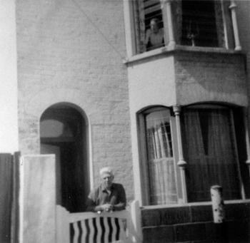 George Hames, (1900-1988) at the gate and Helen Hames, looking out of the window at their house at No. 1 Chapel House Street, since demolished. George Hames started work as a youth with Locke Lancasters and spent most of his working life with Samuel Cutlers, the gas holder makers in Westferry Road. Helen Hames lost all her family when a landmine fell on their air-raid shelter. She never really recovered from this loss, and died in the 1960s. Both Mr and Mrs Hames were active members and helpers at the Docklands Settlement. by G. Hames